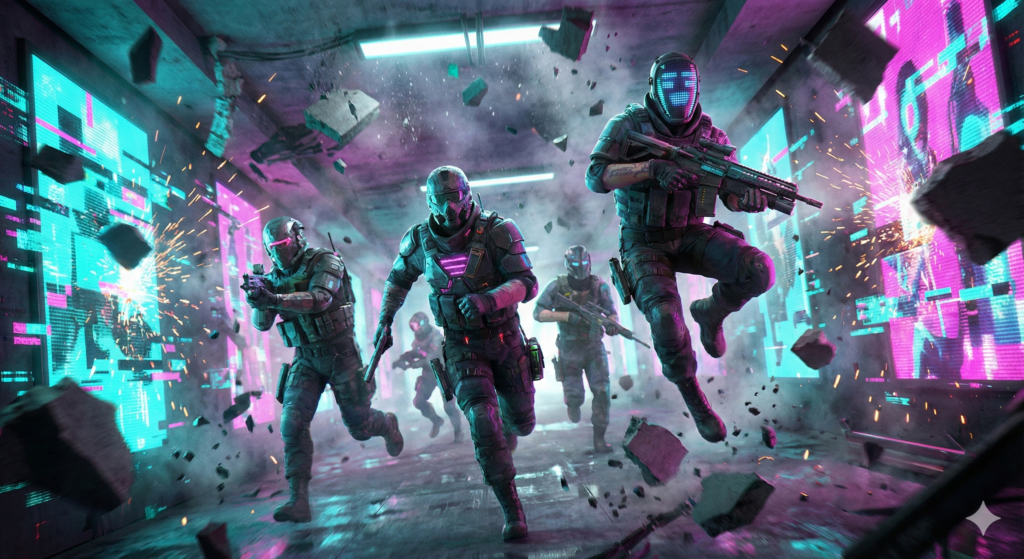 The corridor flickered with corrupted neon light as gravity spasmed in uneven pulses. Navigation systems failed almost immediately, replaced by ghosted afterimages of paths that no longer existed. Syndicate scouts advanced by instinct, following flickers of glitch energy bleeding through fractured walls.
